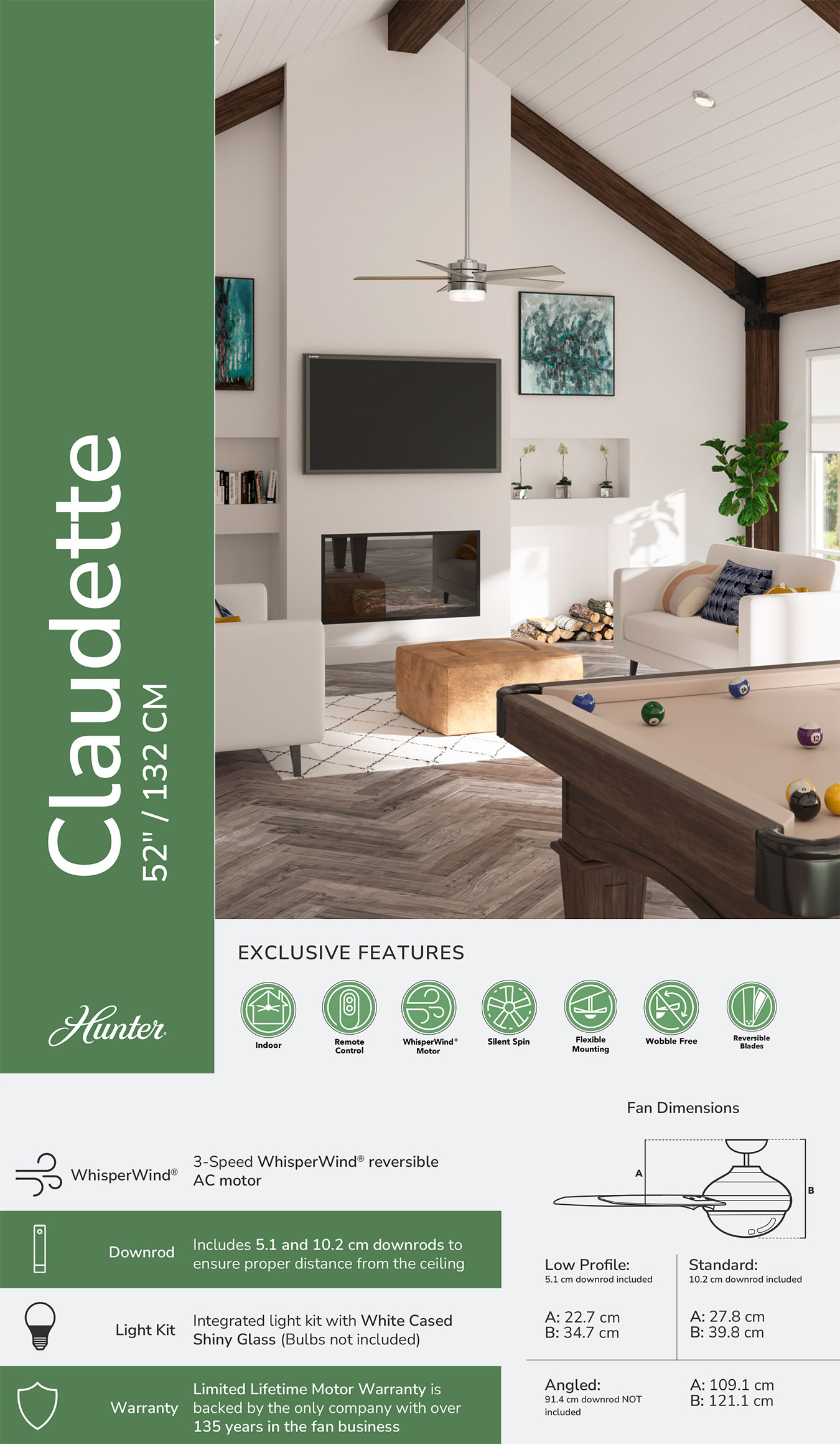 Ανεμιστήρας οροφής HUNTER Claudette - Polished Nickel - Light Greyed Oak-Drifted Oak 132cm 50652