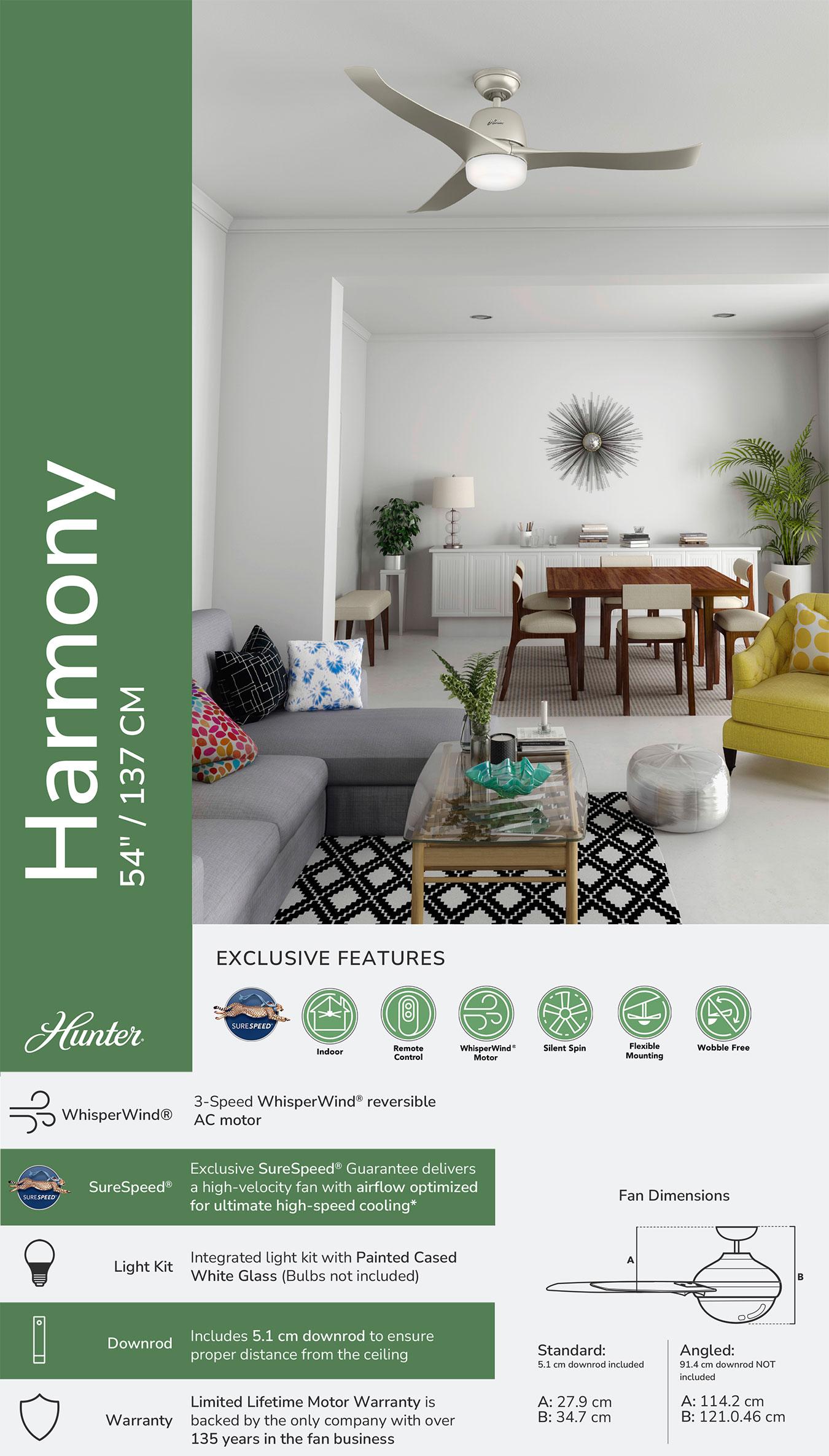 Ανεμιστήρας οροφής HUNTER HARMONY WE 54 (137cm) 50626 Λευκό - Λευκό