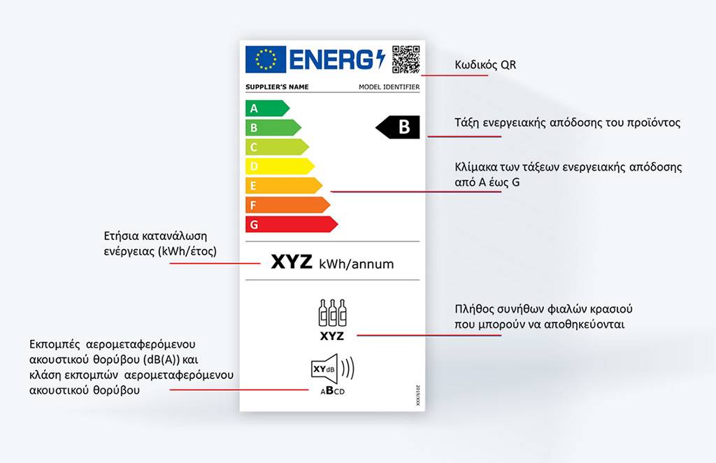Αντιστοίχως, οι ενεργειακές ετικέτες των συντηρητών κρασιού περιλαμβάνουν επεξηγήσεις για: