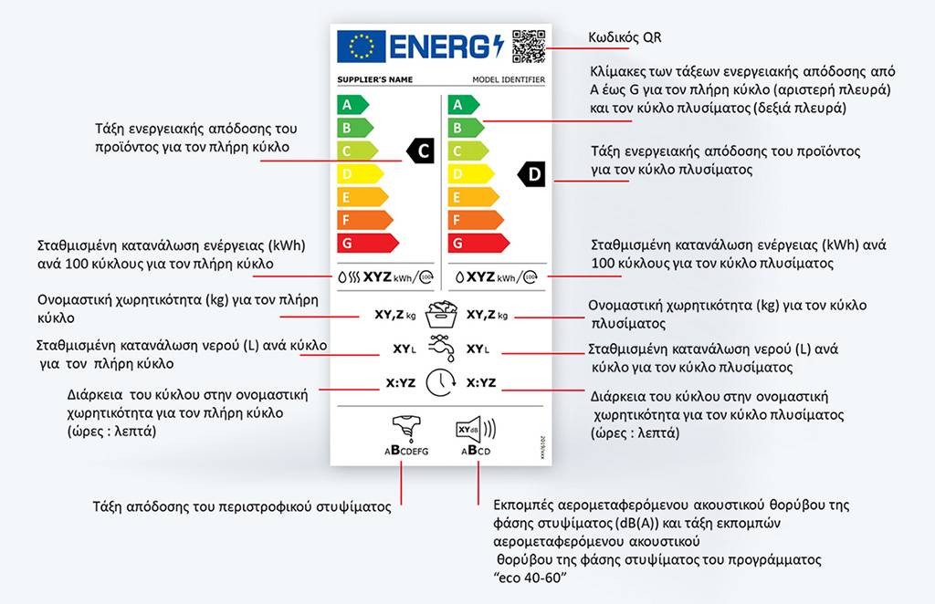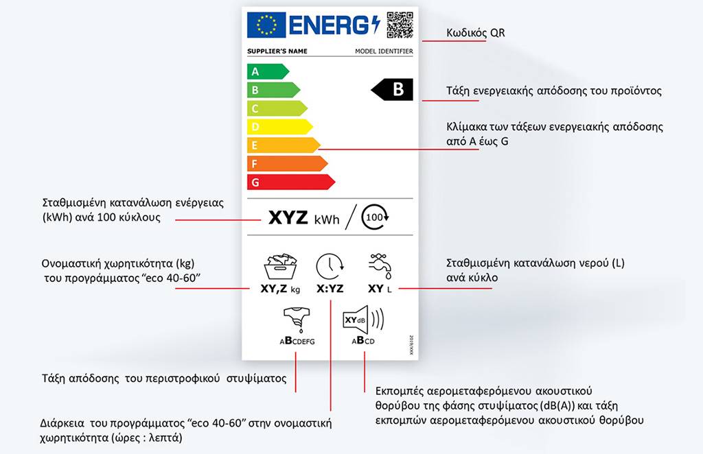 Πιο αναλυτικά, οι ανανεωμένες ενεργειακές ετικέτες των πλυντηρίων σας ενημερώνουν για τα ακόλουθα στοιχεία: