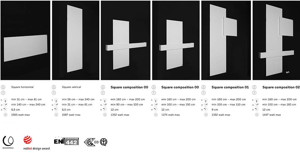 Το Square χαρακτηρίζεται από ελαφριά δομή αλουμινίου πάχους 28 mm. Η θερμότητα κατανέμεται πολύ ομοιόμορφα στην ακτινοβολούμενη επιφάνεια χάρη σε μια ειδική πτέρυγα που συνδέεται στην πλάτη. Έρχεται σε ορθογώνιο ή τετράγωνο σχήμα, σε υδραυλική ή ηλεκτρική έκδοση και μπορεί να εγκατασταθεί κάθετα ή οριζόντια. Το συντονισμένο στοιχείο «maniglione» ολοκληρώνει τη λειτουργικότητα του Square με ένα εύχρηστο ηλεκτρικό θερμαντήρα πετσετών που μπορεί να συνδυαστεί με τη μονάδα ακτινοβολίας σε μια μεγάλη ποικιλία αισθητικών λύσεων.
