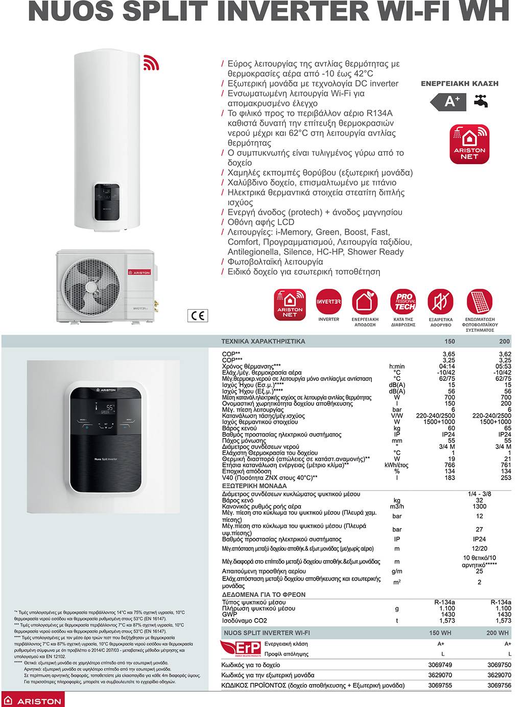 Επίτοιχη αντλία θερμότητας νερού split Ariston Nuos Split Inverter WiFi 200 WH