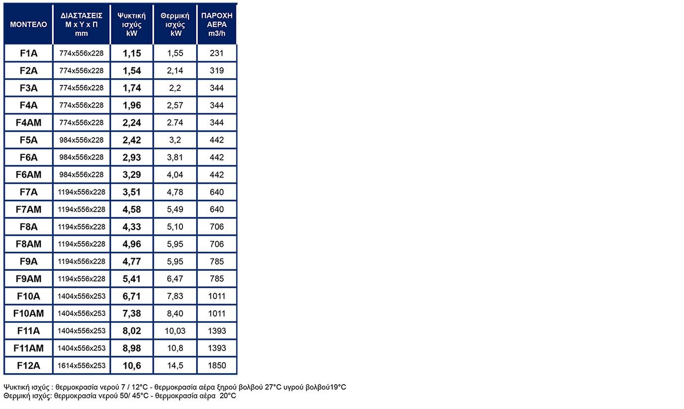 20 μοντέλα με ψυκτική απόδοση από 1 έως 11 KW, σε 8 διαφορετικές εκδόσεις: