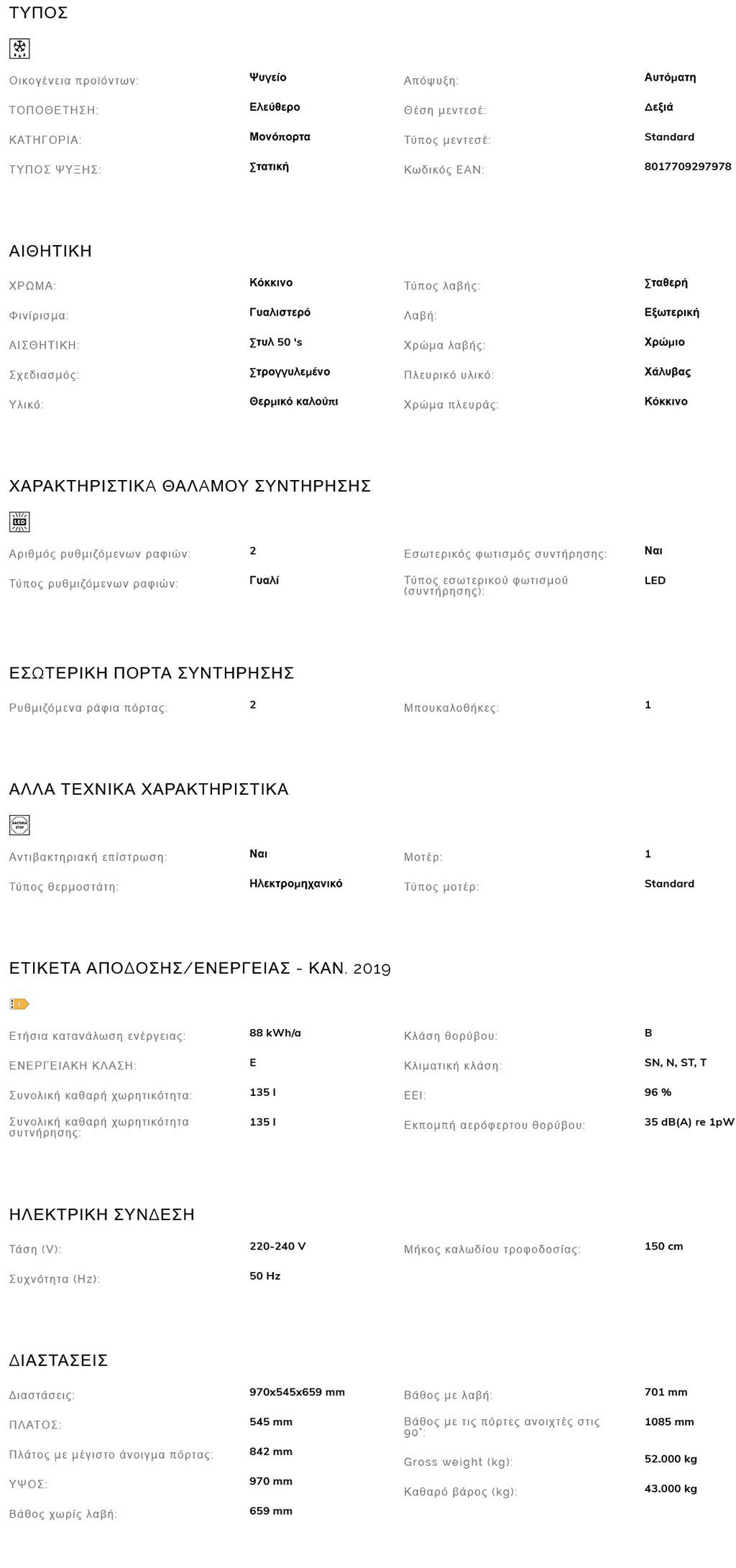 Ψυγείο Smeg FAB10HRRD5 BAR 135L Κόκκινο Δεξί