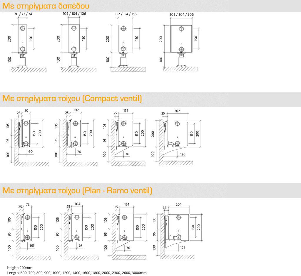 Τα ιδιαίτερα χαμηλού ύψους θερμαντικά σώματα COMPACT VENTIL 200 mm αντικαθιστούν εν μέρει τους παραδοσιακούς κονβέκτορες με αισθητά χαμηλότερο κόστος. Διατίθενται σε κλασικές ή επίπεδες όψεις, με ενσωματωμένο βρόγχο. Παραδίδονται σε τύπους 21, 22, 33 και 44 και τοποθετούνται σε τοίχο ή δάπεδο (τύπος 44 και FFCV διπλής επίπεδης όψης, τοποθέτηση μόνο σε δάπεδο).