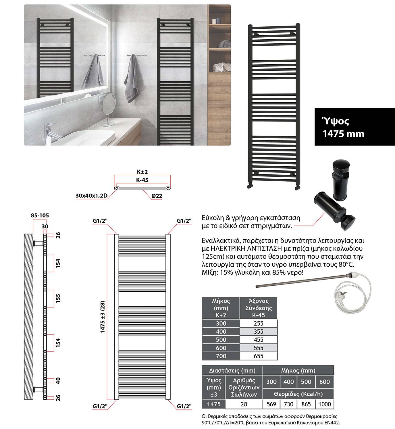 Σώμα καλοριφέρ λουτρού ΑΡΤΕΜΙΣ Μαύρο 1475x400 mm - 730Kcal
