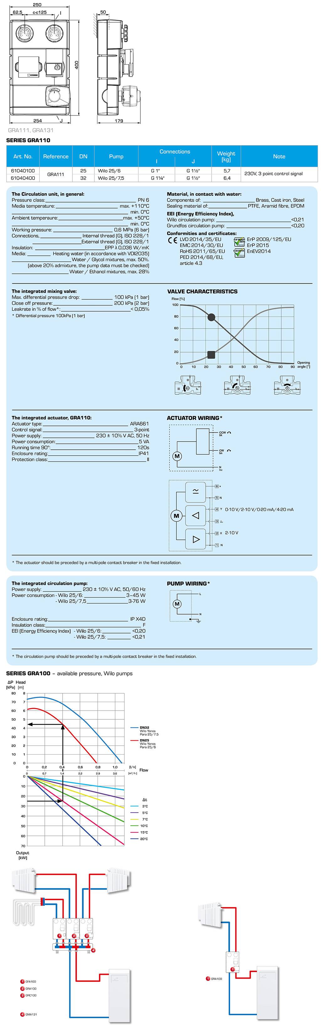 Υδραυλική μονάδα ανάμιξης με τρίοδη βάνα, κινητήρα ARA661 και κυκλοφορητή WILO 25/7.5