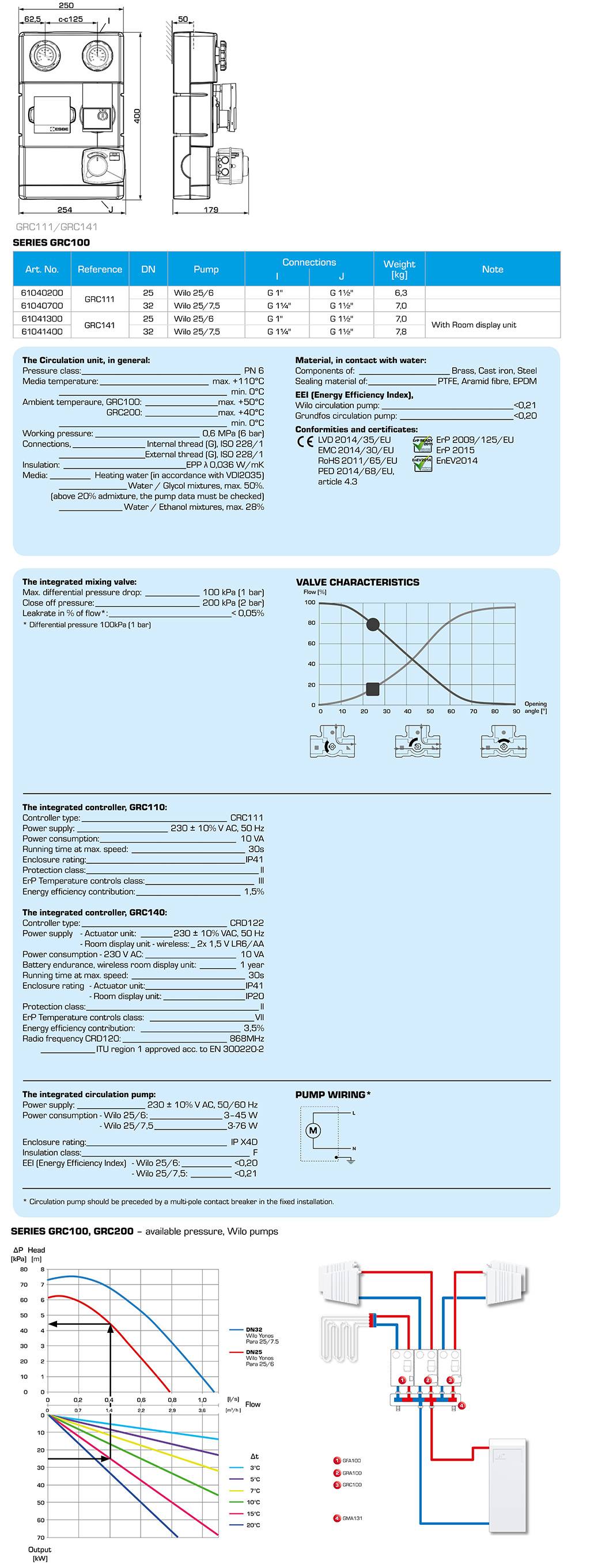 Υδραυλική μονάδα ανάμιξης με τρίοδη βάνα, αντιστάθμιση CRC111, εξωτερικό αισθητήριο θερμοκρασίας και κυκλοφορητή WILO 25/7.5